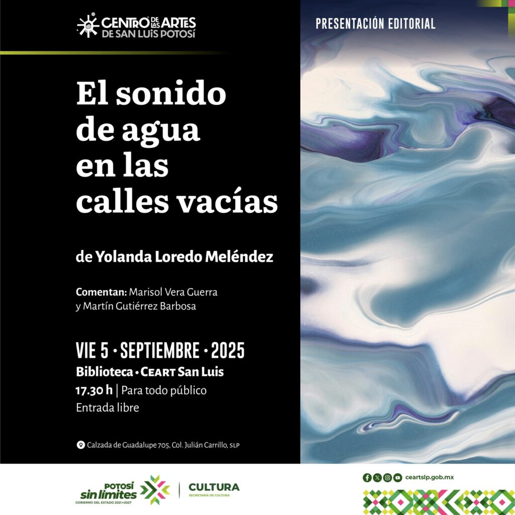📚 💠 Te esperamos en la presentación del libro «El sonido del agua en las calles vacías» obra de la narradora y poeta potosina Yolanda Loredo Meléndez, comentarios a cargo de Marisol Vera Guerra y Martín Gutiérrez Barbosa.