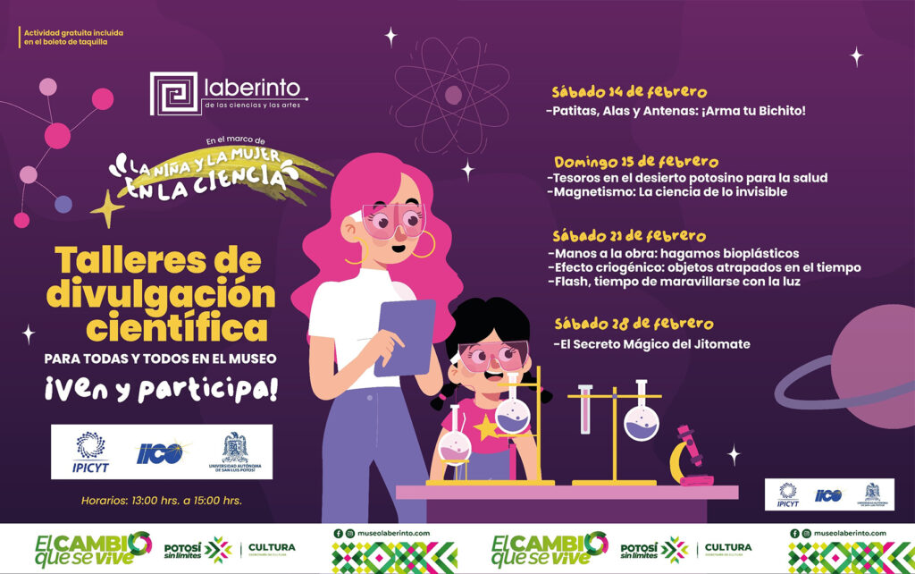 En el marco del Día de la Niña y la Mujer en la Ciencia, el Museo Laberinto de las Ciencias y las Artes te invita a participar en los Talleres de Divulgación Científica, en colaboración con IPICYT, ICCO y la Universidad Autónoma de San Luis Potosí, para que chicos y grandes descubran que el conocimiento no tiene límites.