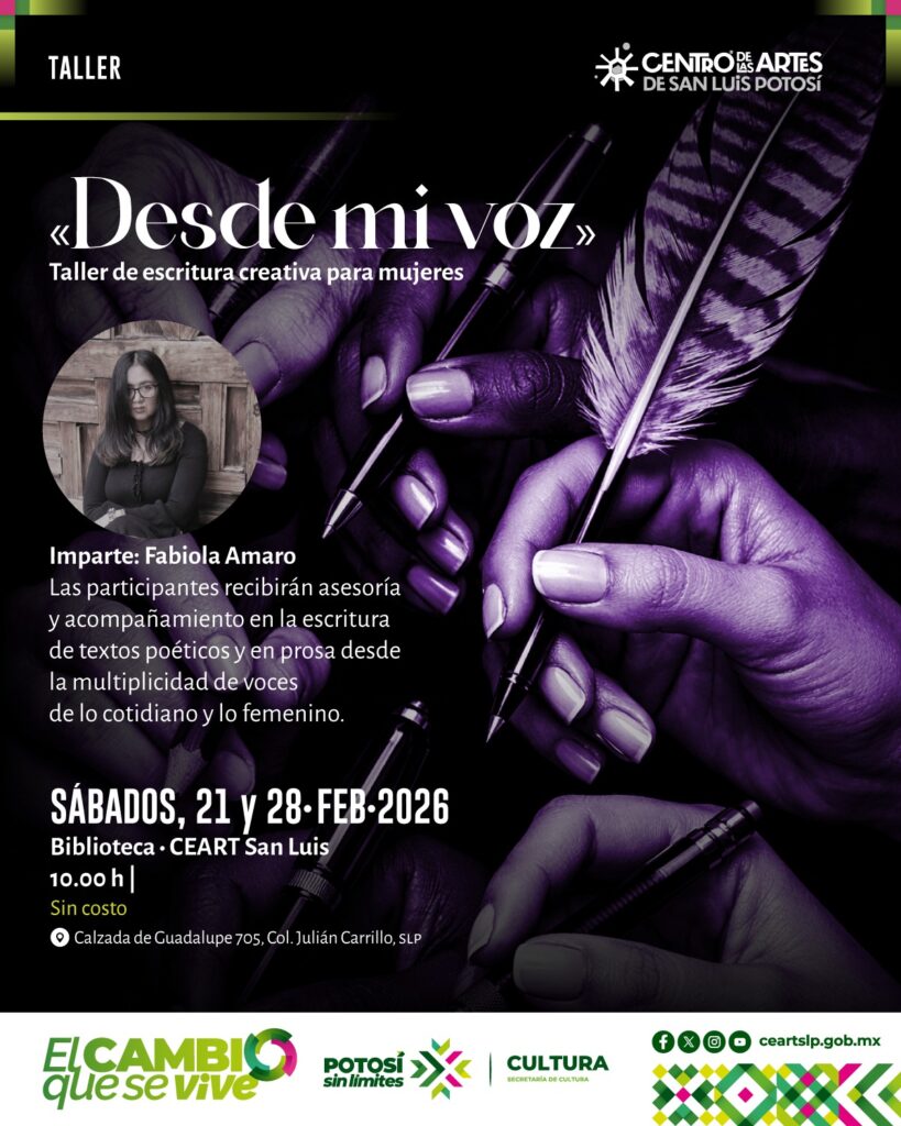 Recuerda, el Centro de las Artes de San Luis Potosí te invita a participar en el taller de escritura creativa para mujeres «Desde mi voz», un espacio diseñado para explorar la palabra desde la experiencia cotidiana y la diversidad de lo femenino, el cual será impartido por la reconocida poeta y escritora potosina Fabiola Amaro.